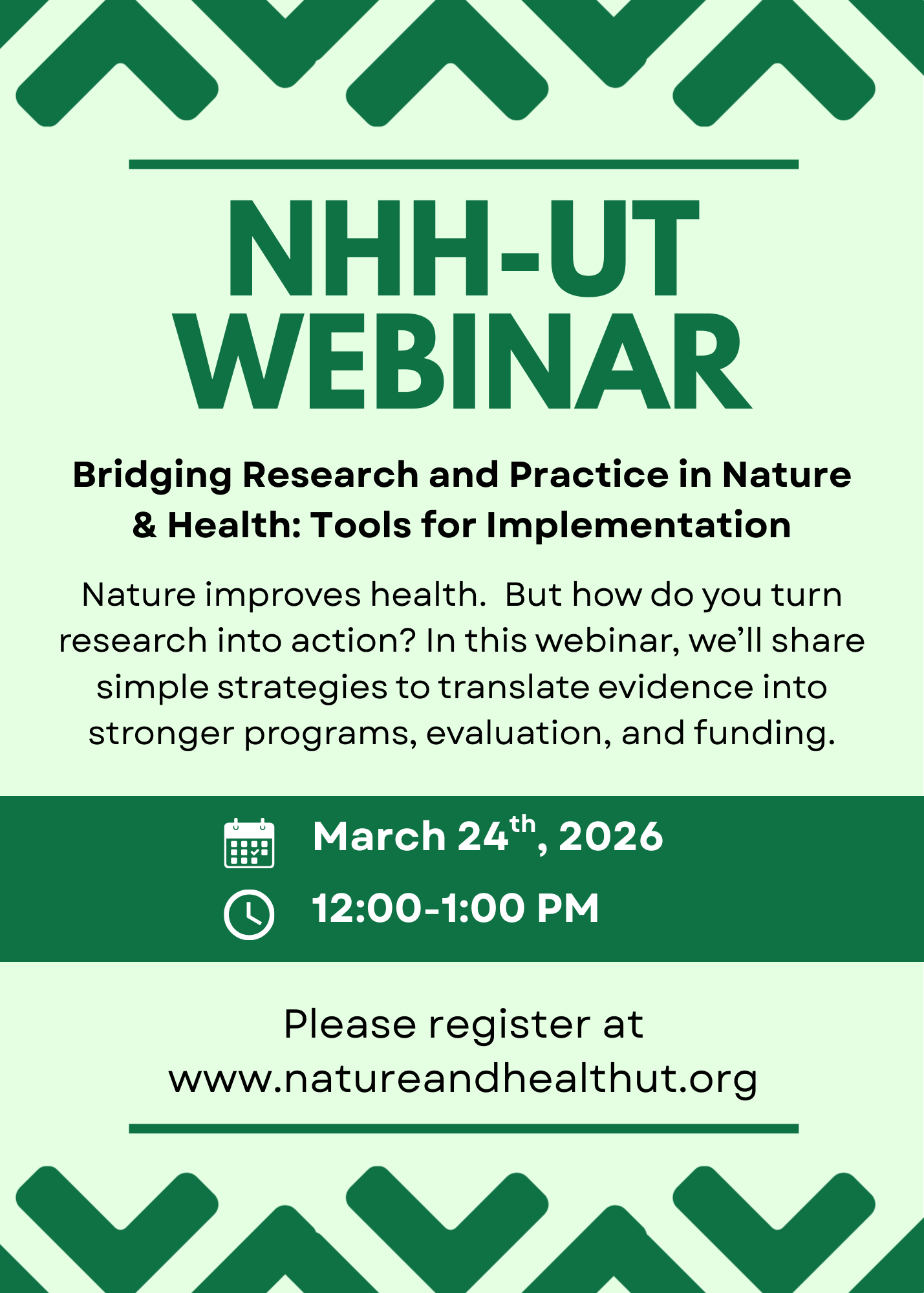 Practitioners often recognize the growing evidence linking nature exposure to improved health outcomes, but translating research into actionable programming can be challenging. In this webinar, Nature and Human Health Utah will share a practical framework for turning academic studies into tools that strengthen program design, evaluation, and funding narratives. Participants will leave with clear strategies for bridging research and practice in their own settings, along with optional pathways for continued support.
